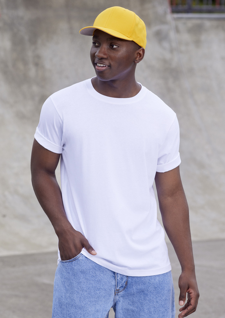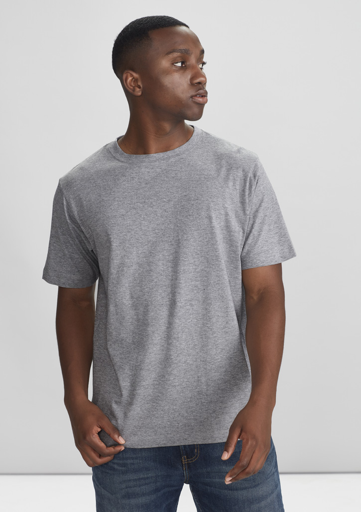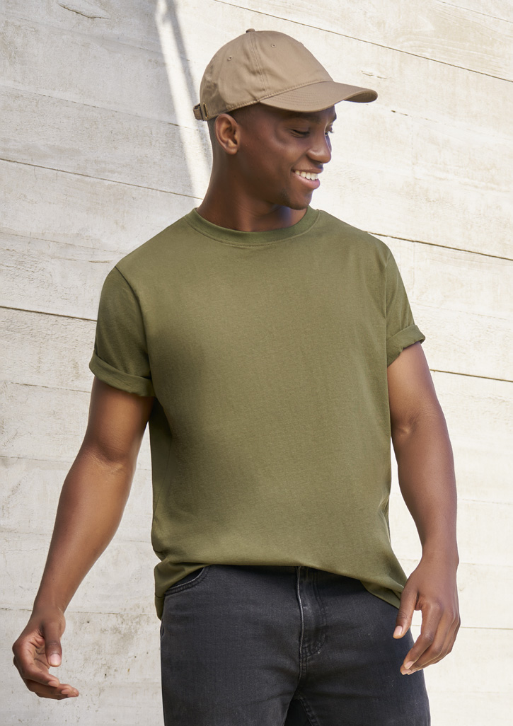 Easy care 100% cotton tee with ribbed elastane neck for stretch.